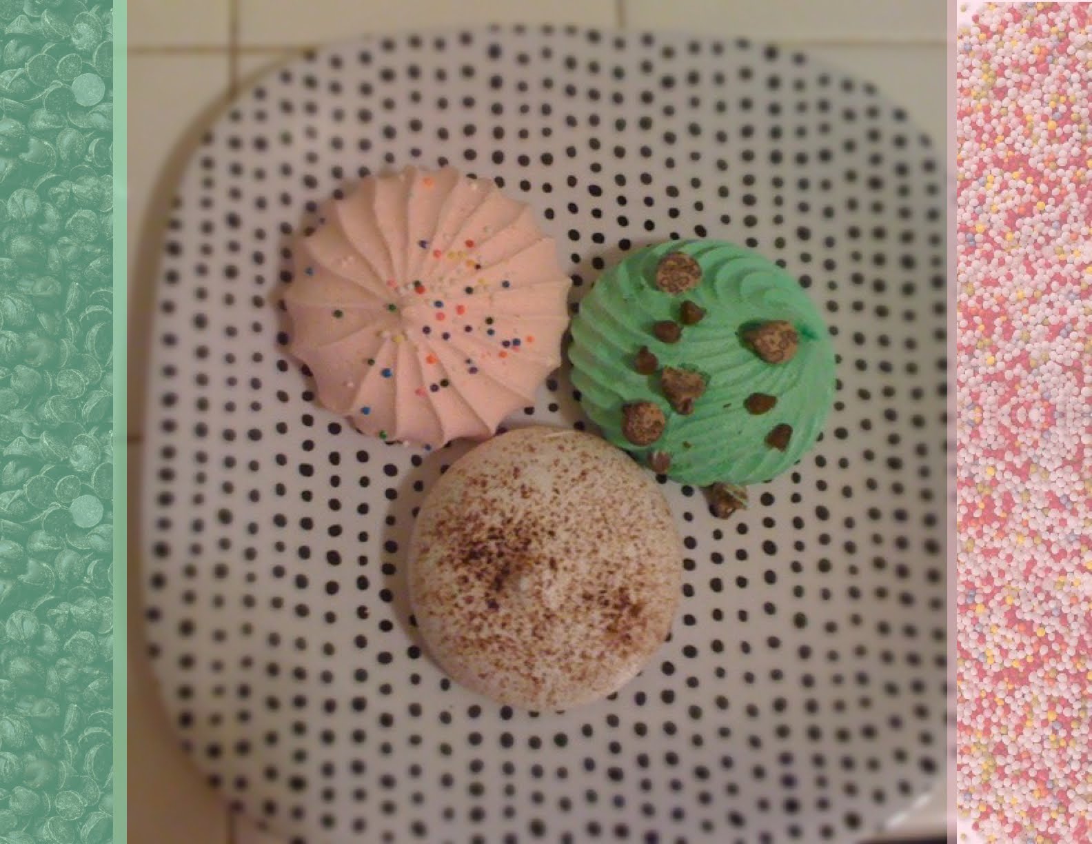 As I passed the cutest little french bakery the other day, close to my house, I was delighted to find an array of flavors of a similar cookie, meringues. I couldn't help but want them all, but I chose these three... mint & chocolate chips, vanilla with cocoa, and strawberry.